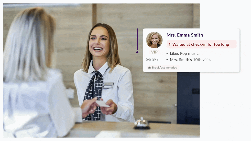 Nous pouvons utiliser les caméras de vidéosurveillance existantes pour enregistrer les clients à la réception, faire correspondre les données de leur PMS (et d'autres systèmes) grâce à nos connecteurs Gaia, et aider le personnel à recevoir des profils de clients avec des informations pertinentes lorsque les clients entrent dans les installations.