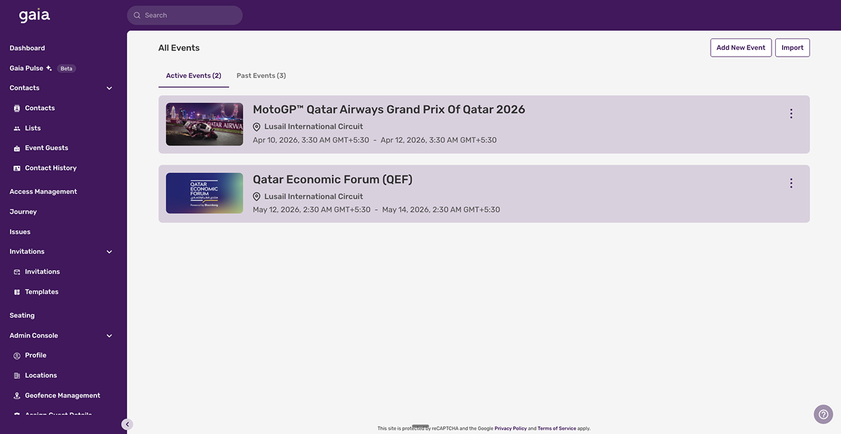 Before events, Gaia manages guest profiles, invitations, and companion registration. During events, it handles arrival notifications, real-time journey tracking, check-ins, and issue capture. After events, it provides analytics on no-shows, journey completeness, ROI, and enriches profiles for future personalisation.