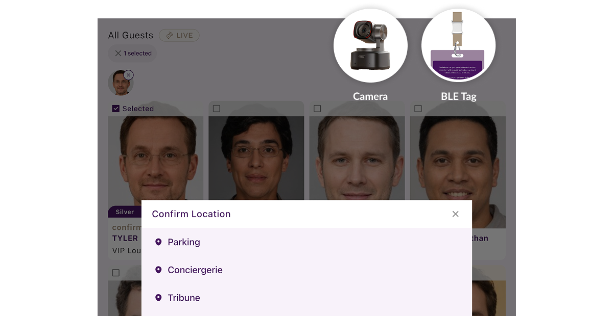 Gaia uses multiple tracking methods: geofencing to detect when guests approach the venue, BLE (Bluetooth Low Energy) tags or accreditations for automatic detection, camera-based recognition, and manual check-ins via the staff app.